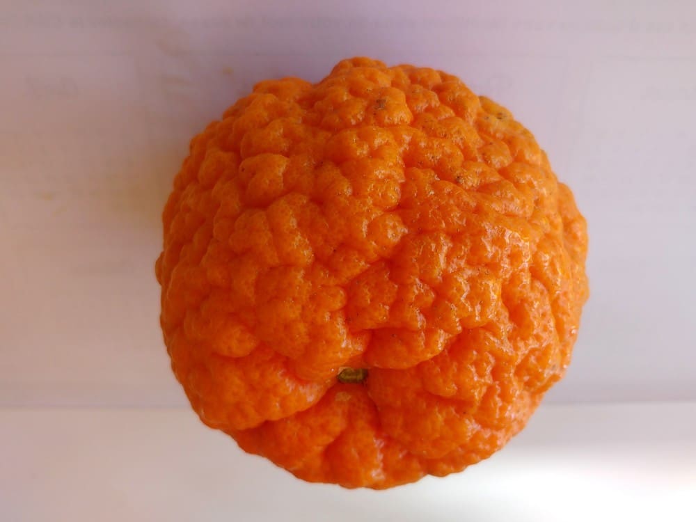 est une mandarine mûr en décembre-janvier. Je n’oublierai jamais cette découverte lors d'une visite au verger conservatoire de San Guiliano. Sa peau toute bosselée en fait vraiment une mandarine unique. Les fruits peuvent rester longtemps sur l'arbre ce qui permet de les manger à fur et à mesure. Les fruits font environ 9 cm, bien juteux. Les mandarines ont une forme aplatie. La peau épaisse est bien colorée et s'enlève facilement. Le goût est bon et avec un bon équilibre sucre-acide. Le fruit sur la photo est en sur-maturité ce qui l'a creusé un peu. On voit qu'il y a peu de pépins. L'arbre est très productif . Nous l'avons greffé sur FA5 pour une bonne résistance au froid et sa croissance rapide avec des fruits d'excellente qualité.