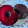 Les fruits du Prunier Kolonodvidnaya ont la peau violet très foncé. La chair est de couleur bordeaux.