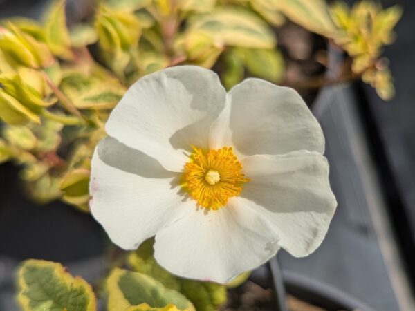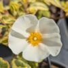 Cistus corbariensis Little Miss Sunshine est un arbuste à feuilles persistantes, vert foncé marginé de jaune. Le feuillage est collant en été: ils contiennent beaucoup d'huile essentiel. Couvre sol à croissance moyenne, dense et ramifié, port en dôme de 60cm. Floraison généreuse de fleurs blanches en avril-mai. Supporte le calcaire, sol drainé, pas trop lourd.Les Cistes sont des arbustes typiquement méditerranéens. Au printemps, les cistes de notre garrigue sont couverts de fleurs roses ou blanches. Les fleurs s’ouvrent le matin, s’épanouissent jusqu’à midi et font tomber les pétales quand la chaleur de l’après midi arrive. Les pétales très fines ont une texture typique de papier crépon, un peu froissé. Peu importe la taille des fleurs, les Cistes sont presque toujours entièrement couverts de fleurs au top de leur période de floraison : ceux à petites fleurs en font bien plus que ceux avec des fleurs plus grandes.