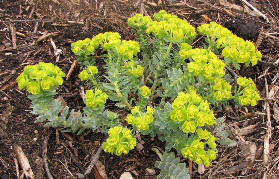 Euphorbe Myrsinite: couvre sol avec des feuilles tournant en hélice, très graphique!