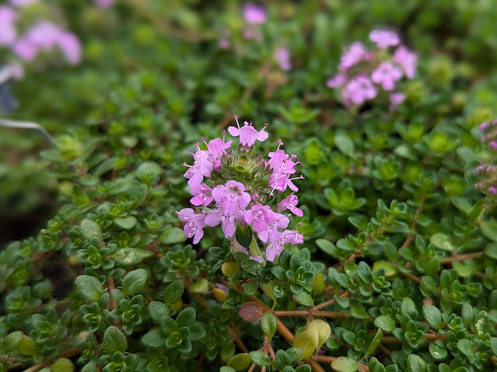 Si vous cherchez une plante rampante énormément résistante à la sécheresse pour diminuer un peu l’arrosage des surfaces, verte, genre pelouse, certains thyms seront parfaits !